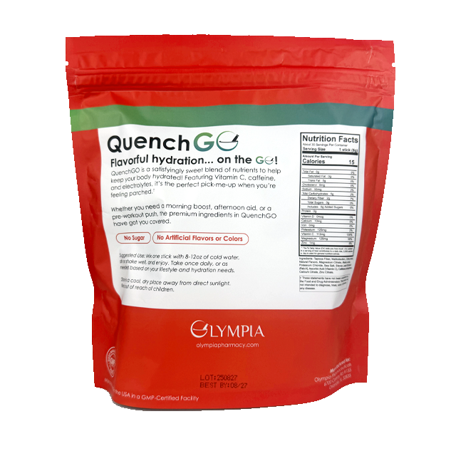 Vegan-friendly, sugar-free, and naturally flavored, OlympiaGO Sticks offer clean, convenient wellness support wherever your day takes you. ImmunityGO blends Zinc and bioflavonoids to help support immune health—ideal during cold and flu season. QuenchGO, available in Strawberry and Pink Lemonade, delivers refreshing hydration and energy with Vitamin C, Magnesium, and Caffeine. Every flavor includes electrolytes to help rehydrate after workouts or late nights.